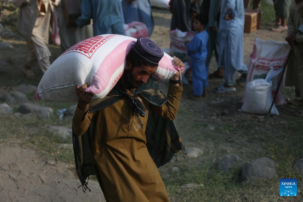 An Afghanistan earthquake victim carries a bag of relief supplies in Suki, Afghanistan, Sept. 10, 2025. (Photo by Saifurahman Safi/Xinhua)