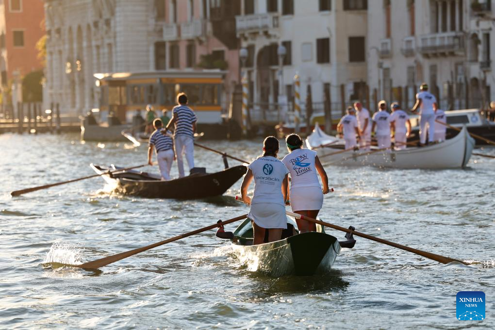 Female rowers practice before the Regata Storica boat race in Venice, Italy, Sept. 4, 2025.(Xinhua/Li Jing)