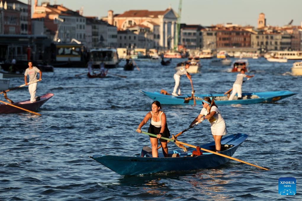 Members of "Row Venice" attend a rehearsal of the Regata Storica boat race in Venice, Italy, Sept. 4, 2025.(Xinhua/Li Jing)