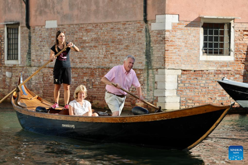 Elena Almansi (R, back), member of "Row Venice," gives a lesson of rowing for tourists in Venice, Italy, Aug. 31, 2025.(Xinhua/Li Jing)