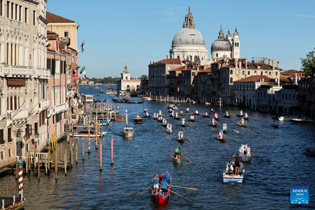 Athletes attend a rehearsal of the Regata Storica boat race in Venice, Italy, Sept. 4, 2025.(Xinhua/Li Jing)