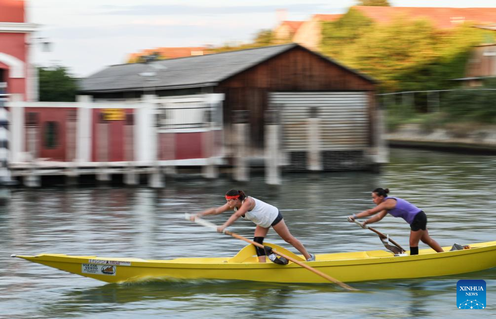 Elena Almansi, member of "Row Venice," practices with her teammate for the Regata Storica boat race in Venice, Italy, Sept. 4, 2025.(Xinhua/Li Jing)