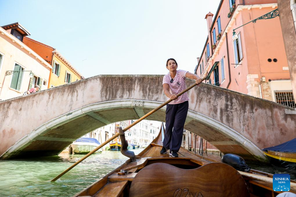 Jane Caporal rows a shrimp-tailed batela on the Grand Canal of Venice, Italy, July 17, 2025.(Xinhua/Li Jing)