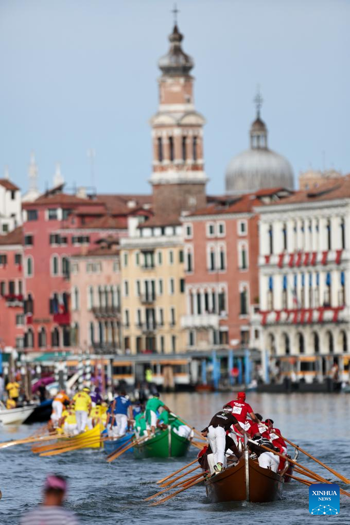 Rowers compete during the Regata Storica boat race in Venice, Italy, Sept. 7, 2025.(Xinhua/Li Jing)