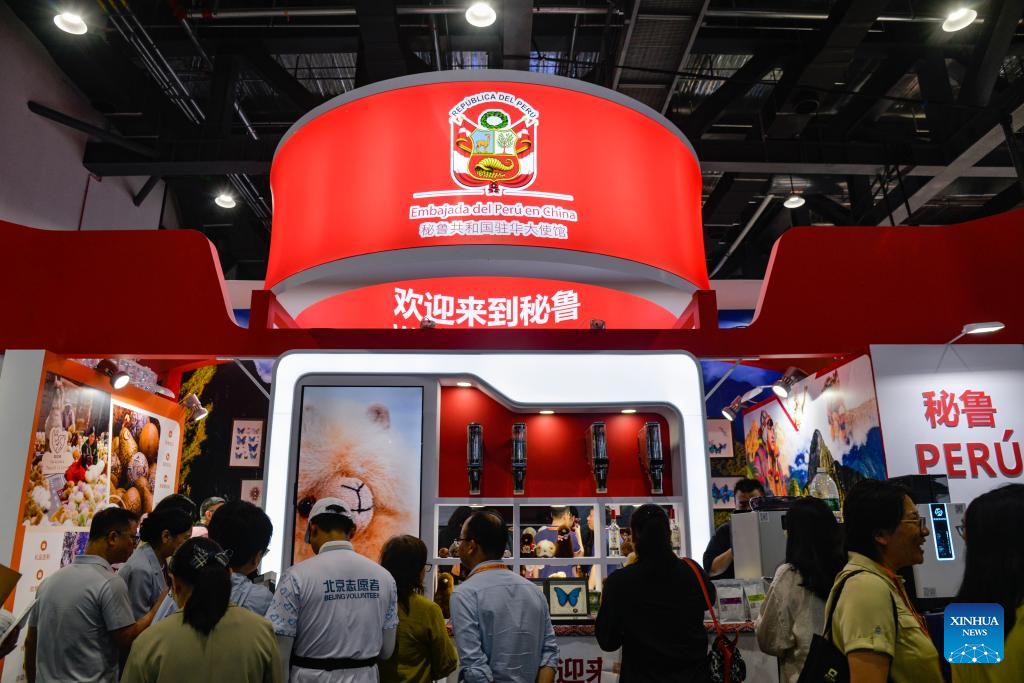 Visitors visit the Peruvian booth of the thematic exhibitions during the 2025 China International Fair for Trade in Services (CIFTIS) at Shougang Park in Beijing, capital of China, Sept. 10, 2025. The 2025 CIFTIS opened in Beijing on Wednesday, themed "Embrace Intelligent Technologies, Empower Trade in Services."