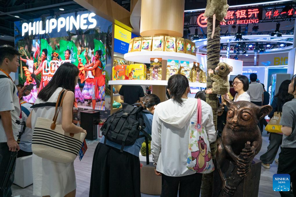 Visitors learn about Philippine products at the Philippine pavilion of the thematic exhibitions during the 2025 China International Fair for Trade in Services (CIFTIS) at Shougang Park in Beijing, capital of China, Sept. 10, 2025. The 2025 CIFTIS opened in Beijing on Wednesday, themed "Embrace Intelligent Technologies, Empower Trade in Services."