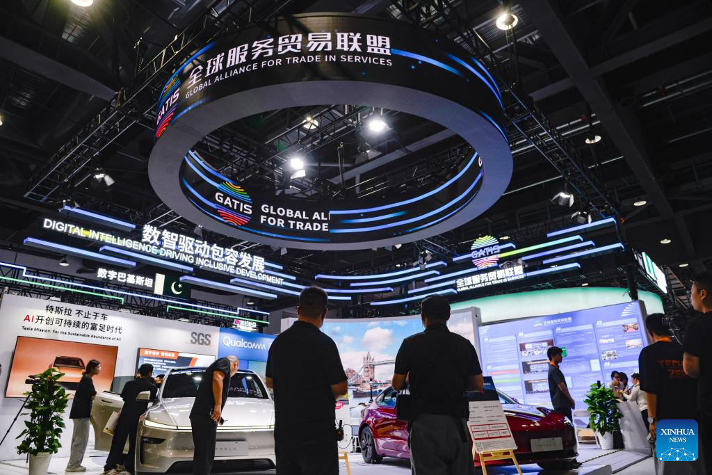This photo taken on Sept. 10, 2025 shows the booth of the Global Alliance for Trade in Services of the thematic exhibitions during the 2025 China International Fair for Trade in Services (CIFTIS) at Shougang Park in Beijing, capital of China. The 2025 CIFTIS opened in Beijing on Wednesday, themed "Embrace Intelligent Technologies, Empower Trade in Services."