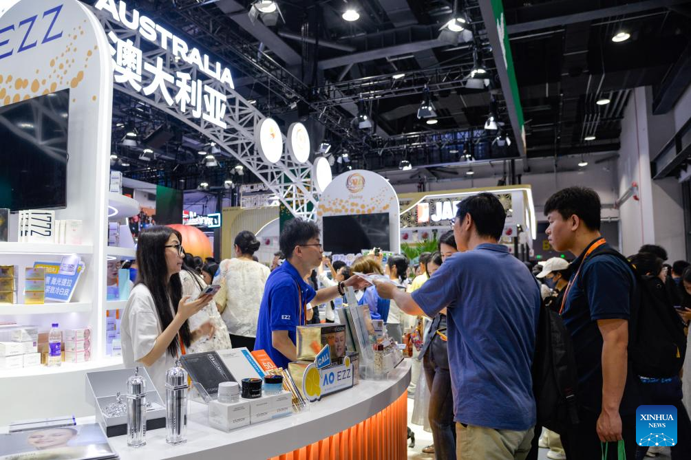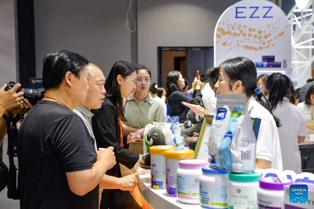 Visitors learn about health products at the Australian pavilion of the thematic exhibitions during the 2025 China International Fair for Trade in Services (CIFTIS) at Shougang Park in Beijing, capital of China, Sept. 10, 2025. The 2025 CIFTIS opened in Beijing on Wednesday, themed "Embrace Intelligent Technologies, Empower Trade in Services."
