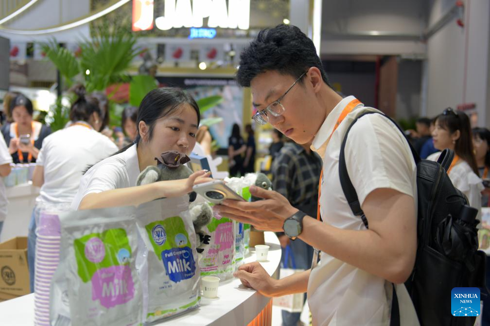 A visitor learns about dairy products during the 2025 China International Fair for Trade in Services (CIFTIS) in Beijing, capital of China, Sept. 10, 2025. The 2025 CIFTIS opened in Beijing on Wednesday, themed "Embrace Intelligent Technologies, Empower Trade in Services." (Xinhua/Zhang Xinjing)