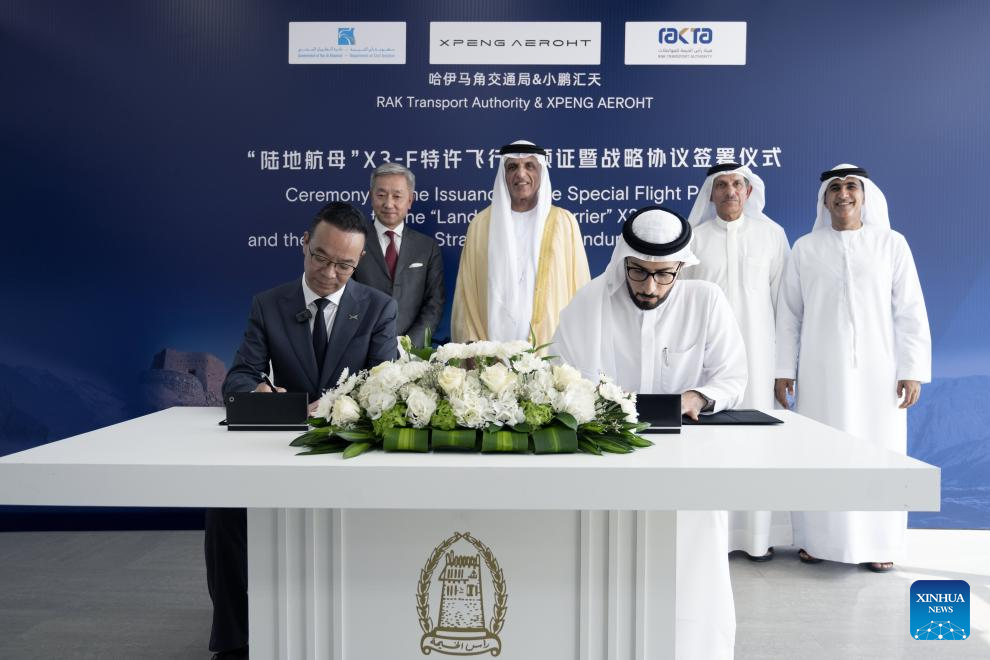 Esmaeel Al Blooshi (front R), director general of the Ras Al Khaimah Transport Authority, and Zhao Deli (front L), founder of XPENG AEROHT, attend a certification ceremony in Ras Al Khaimah, the United Arab Emirates (UAE), Sept. 10, 2025. "Land Aircraft Carrier," a flying car developed by Chinese flying car company XPENG AEROHT, on Wednesday received a special flight permit in Ras Al Khaimah, the northernmost emirate of the UAE. (XPENG/Handout via Xinhua)