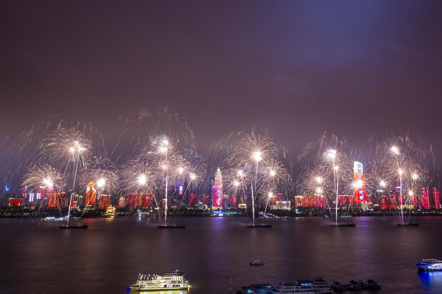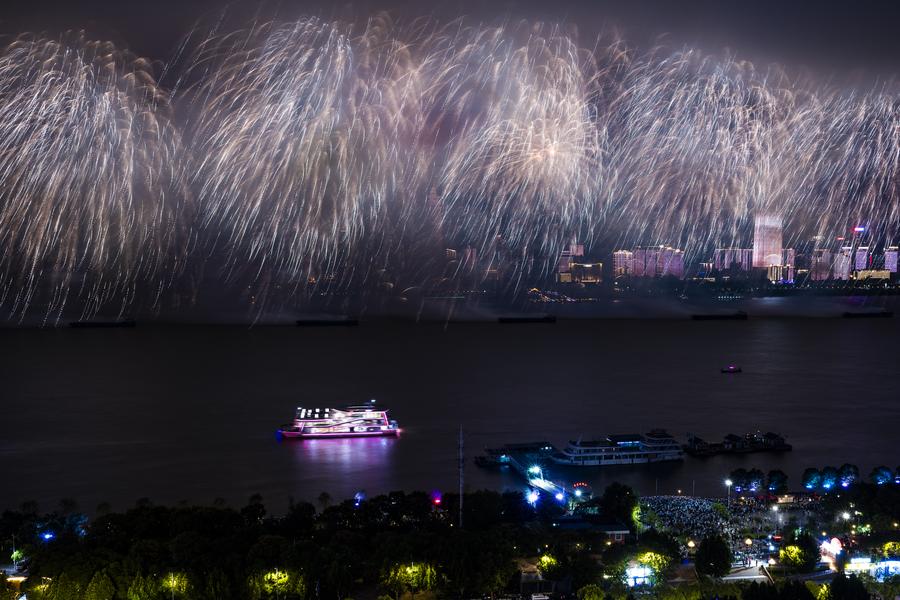 People view fireworks during the opening ceremony of the 2025 Yangtze River cultural and arts season in Wuhan, central China's Hubei Province, Sept. 12, 2025. (Xinhua/Wu Zhizun)