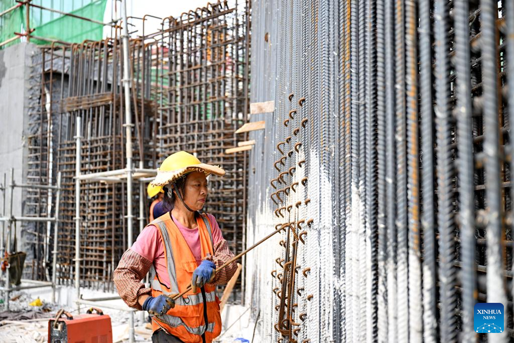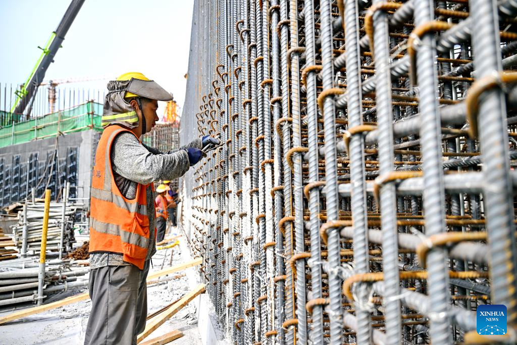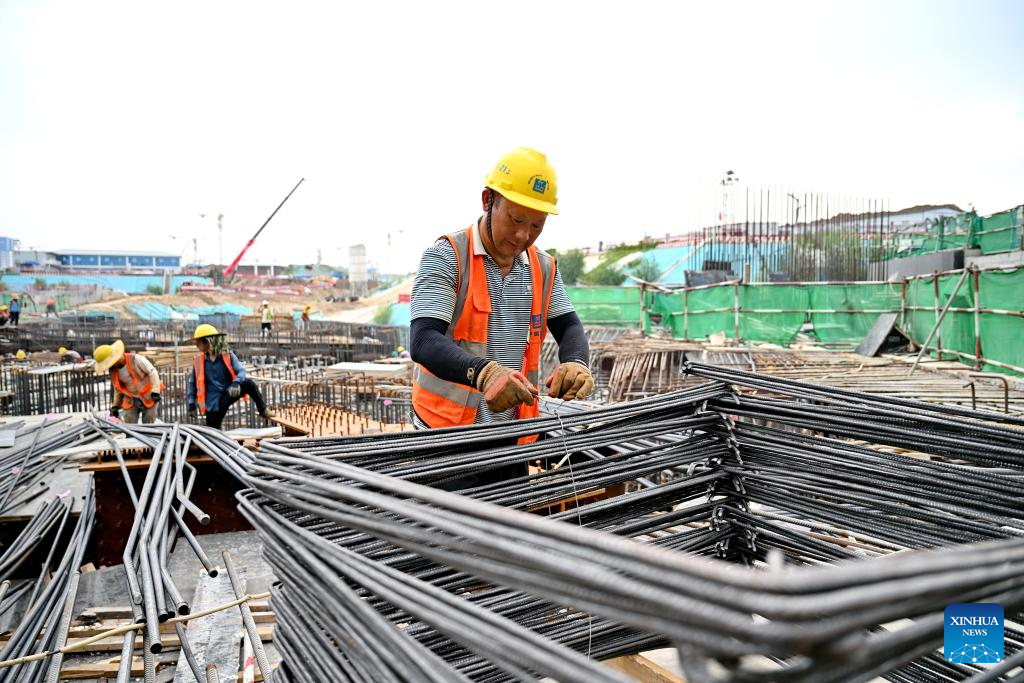 A worker binds up steel bars at a construction site of an underground section of Xiong'an-Xinzhou high-speed railway and the auxiliary projects in Xiong'an, north China's Hebei Province, on Sept. 12, 2025. The underground section of Xiong'an-Xinzhou high-speed railway in the start-up area of Xiong'an New Area is now under construction.