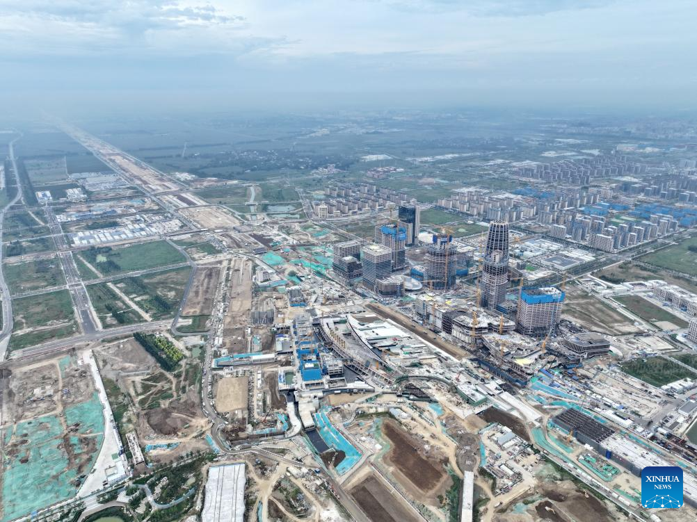 An aerial drone photo taken on Sept. 12, 2025 shows a construction site of an underground section of Xiong'an-Xinzhou high-speed railway and the auxiliary projects in Xiong'an, north China's Hebei Province. The underground section of Xiong'an-Xinzhou high-speed railway in the start-up area of Xiong'an New Area is now under construction.