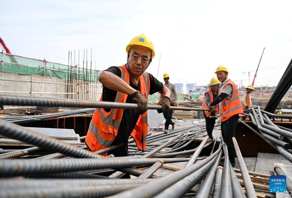 Workers move steel bars at a construction site of an underground section of Xiong'an-Xinzhou high-speed railway and the auxiliary projects in Xiong'an, north China's Hebei Province, on Sept. 12, 2025. The underground section of Xiong'an-Xinzhou high-speed railway in the start-up area of Xiong'an New Area is now under construction.