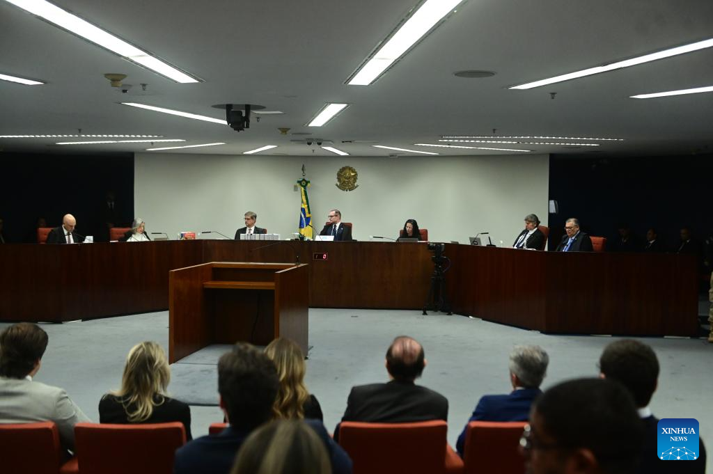 Justices of the Brazilian Supreme Federal Court meet for the verdict and sentencing phase of a trial over an alleged coup plot of former Brazilian President Jair Bolsonaro to seize power following his defeat in the 2022 presidential election, in Brasilia, Brazil, Sept. 11, 2025. Former Brazilian President Jair Bolsonaro was sentenced to 27 years and three months in prison on Thursday after four out of five Supreme Federal Court justices voted to convict him of attempting a coup. Bolsonaro was found guilty on five counts -- plotting a coup d'etat, attempted violent abolition of the democratic rule of law, participation in an armed criminal organization, aggravated damage, and deterioration of listed heritage sites. (Photo by Lucio Tavora/Xinhua)