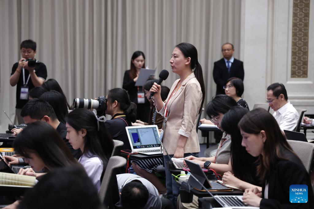 A journalist asks questions at a press conference held by the State Council Information Office (SCIO) on fiscal reform and development achievements in the 14th Five-Year Plan period (2021-2025) in Beijing, capital of China, Sept. 12, 2025. Chinese Finance Minister Lan Fo'an attended the press conference held here on Friday. (Xinhua/Jin Liwang)