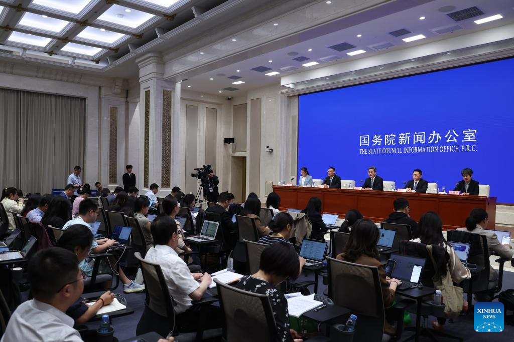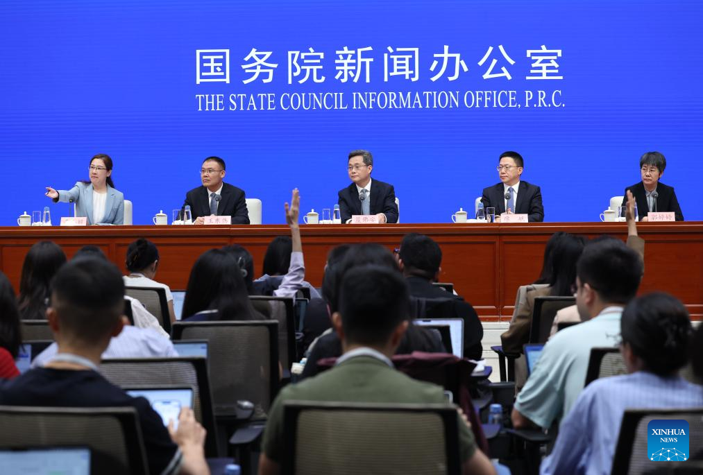 Chinese Finance Minister Lan Fo'an (C, back) attends a press conference held by the State Council Information Office (SCIO) on fiscal reform and development achievements in the 14th Five-Year Plan period (2021-2025) in Beijing, capital of China, Sept. 12, 2025. (Xinhua/Jin Liwang)
