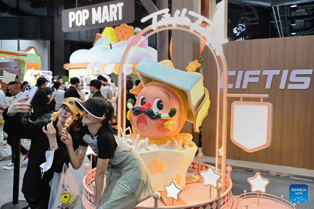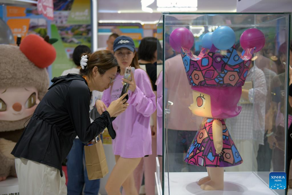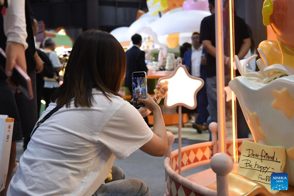 A visitor takes pictures of a popsicle of Twinkle Twinkle at the Pop Mart booth at the 2025 China International Fair for Trade in Services (CIFTIS) in Beijing, capital of China, Sept. 10, 2025. The 2025 CIFTIS is held from Sept. 10 to 14 at the Shougang Park in Beijing. This year's fair features a wide range of cultural and creative products, which are highly popular among visitors. (Xinhua/Liu Lingyi)