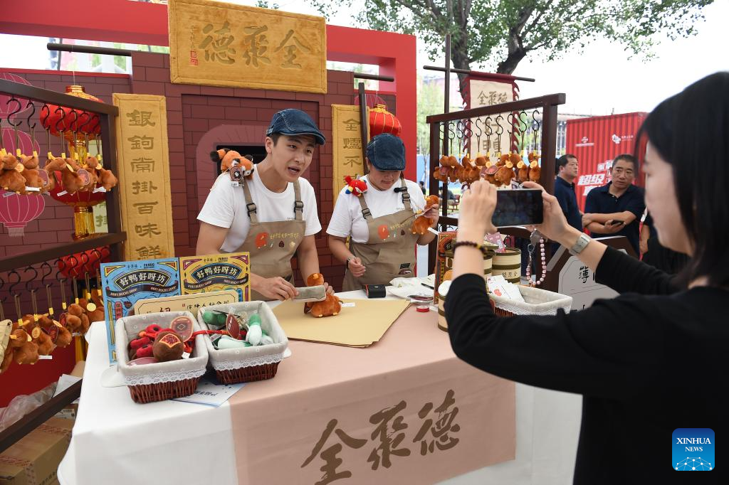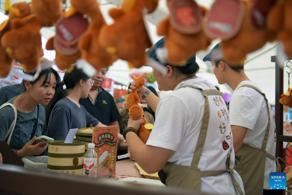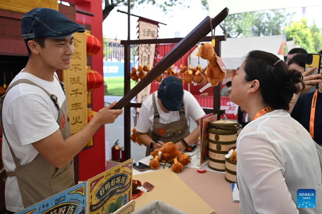 People select roast duck cultural and creative products of Quanjude, a time-honored brand for Peking roast duck, displayed at the 2025 China International Fair for Trade in Services (CIFTIS) in Beijing, capital of China, Sept. 12, 2025. The 2025 CIFTIS is held from Sept. 10 to 14 at the Shougang Park in Beijing. This year's fair features a wide range of cultural and creative products, which are highly popular among visitors. (Xinhua/Zhang Xinjing)