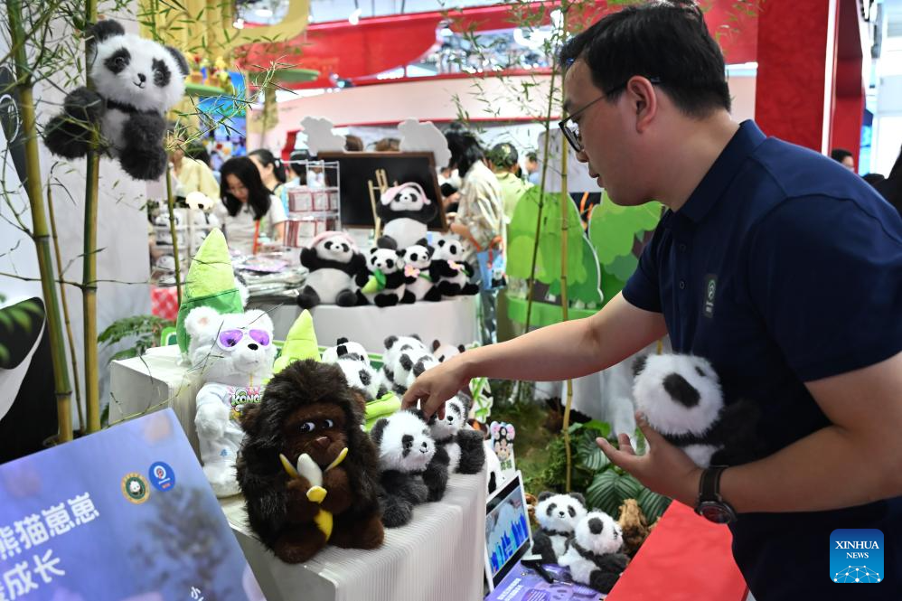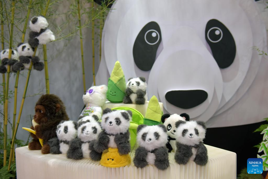 Panda-themed cultural and creative products are displayed at the 2025 China International Fair for Trade in Services (CIFTIS) in Beijing, capital of China, Sept. 11, 2025. The 2025 CIFTIS is held from Sept. 10 to 14 at the Shougang Park in Beijing. This year's fair features a wide range of cultural and creative products, which are highly popular among visitors. (Xinhua/Zhang Xinjing)