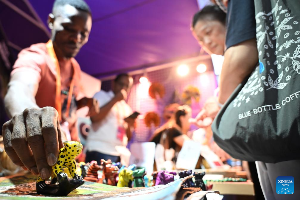 People view stone carving cultural and creative products at the exhibition booth of the Embassy of the Republic of Rwanda during the 2025 China International Fair for Trade in Services (CIFTIS) in Beijing, capital of China, Sept. 12, 2025. The 2025 CIFTIS is held from Sept. 10 to 14 at the Shougang Park in Beijing. This year's fair features a wide range of cultural and creative products, which are highly popular among visitors. (Xinhua/Sui Shangjun)