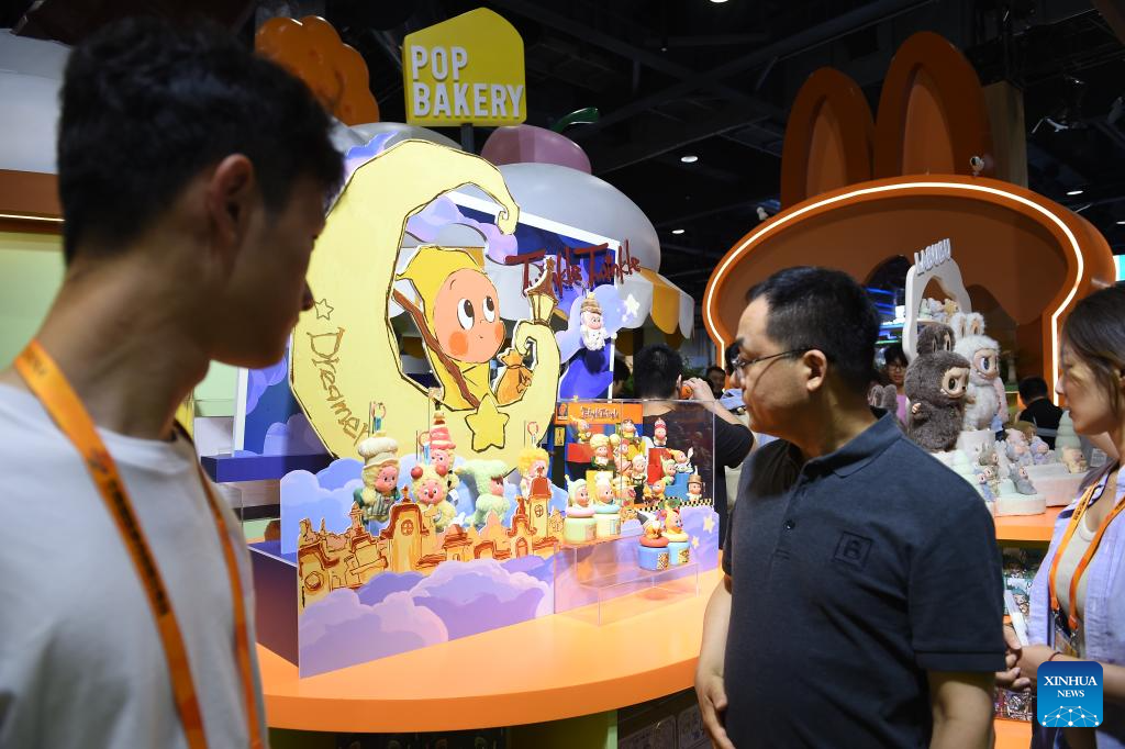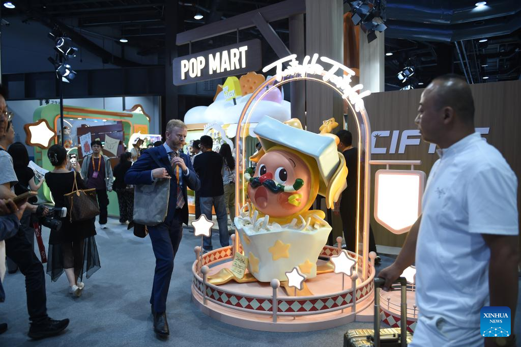 People visit the booth of Pop Mart displayed at the 2025 China International Fair for Trade in Services (CIFTIS) in Beijing, capital of China, Sept. 10, 2025. The 2025 CIFTIS is held from Sept. 10 to 14 at the Shougang Park in Beijing. This year's fair features a wide range of cultural and creative products, which are highly popular among visitors. (Xinhua/Liu Lingyi)