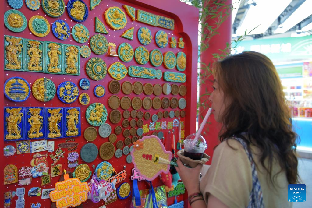 A woman views refrigerator magnets displayed at the 2025 China International Fair for Trade in Services (CIFTIS) in Beijing, capital of China, Sept. 12, 2025. The 2025 CIFTIS is held from Sept. 10 to 14 at the Shougang Park in Beijing. This year's fair features a wide range of cultural and creative products, which are highly popular among visitors. (Xinhua/Zhang Xinjing)