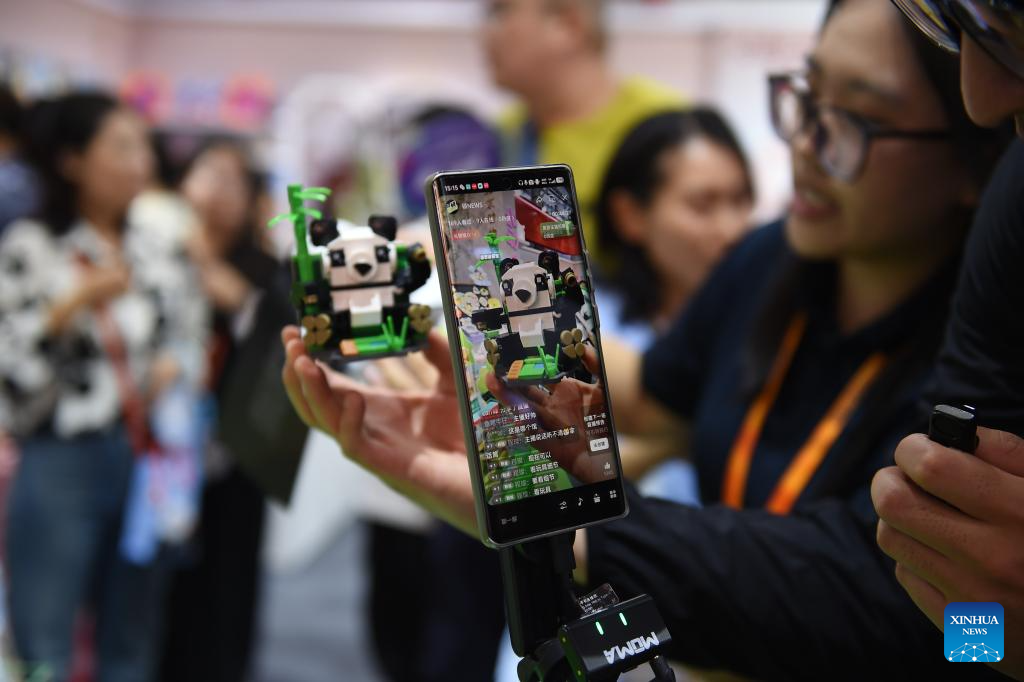 A panda-themed cultural and creative product is promoted via live streaming at the 2025 China International Fair for Trade in Services (CIFTIS) in Beijing, capital of China, Sept. 11, 2025. The 2025 CIFTIS is held from Sept. 10 to 14 at the Shougang Park in Beijing. This year's fair features a wide range of cultural and creative products, which are highly popular among visitors. (Xinhua/Liu Lingyi)