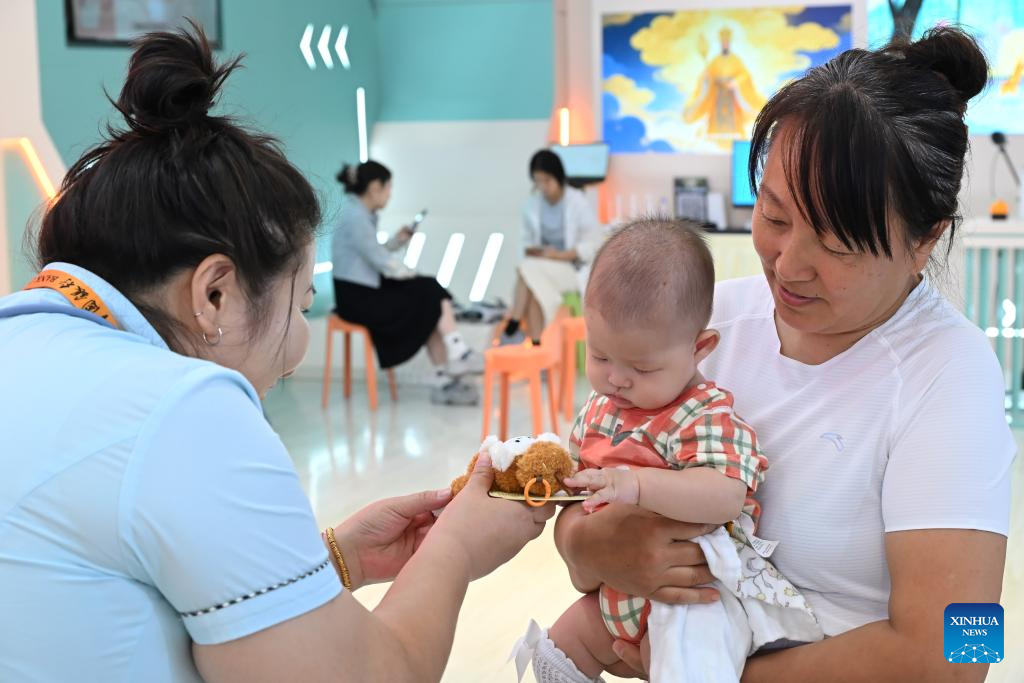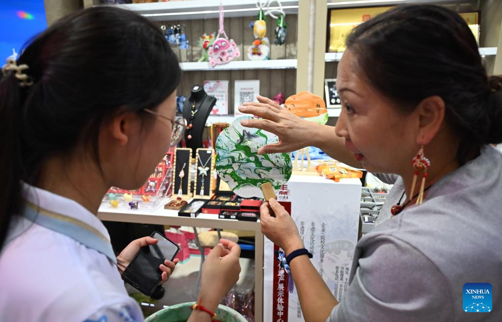 People learn about cultural and creative products displayed at the 2025 China International Fair for Trade in Services (CIFTIS) in Beijing, capital of China, Sept. 11, 2025. The 2025 CIFTIS is held from Sept. 10 to 14 at the Shougang Park in Beijing. This year's fair features a wide range of cultural and creative products, which are highly popular among visitors. (Xinhua/Zhang Xinjing)