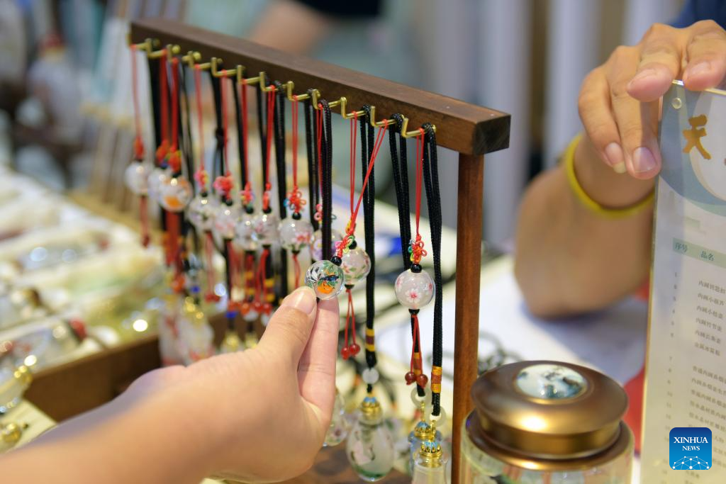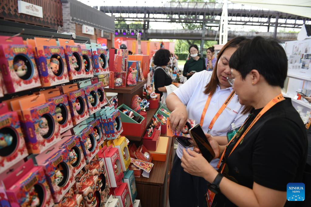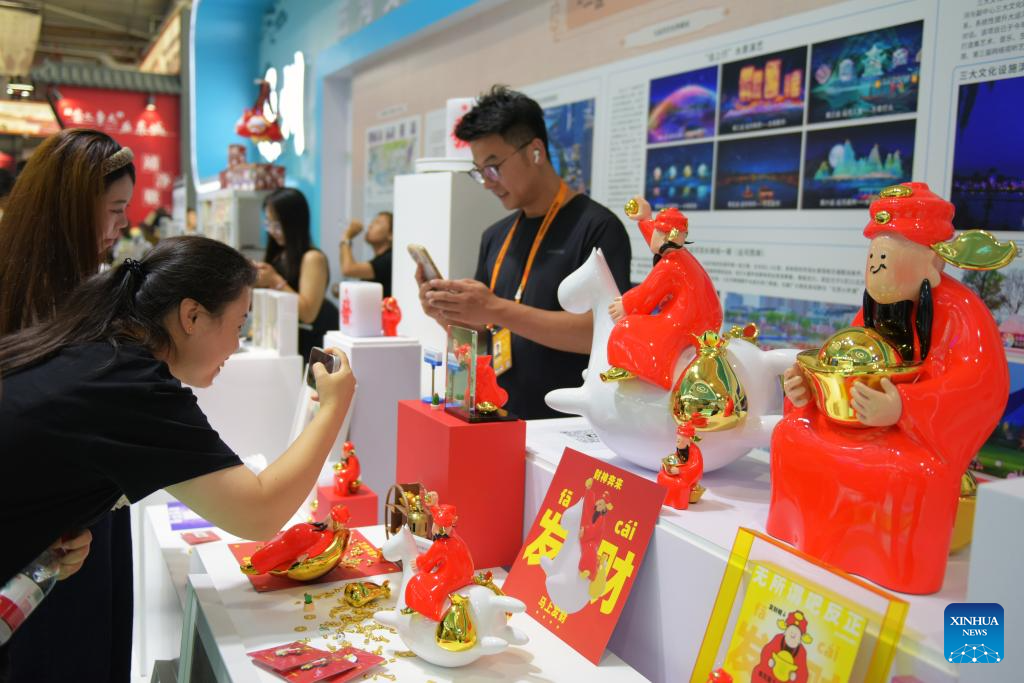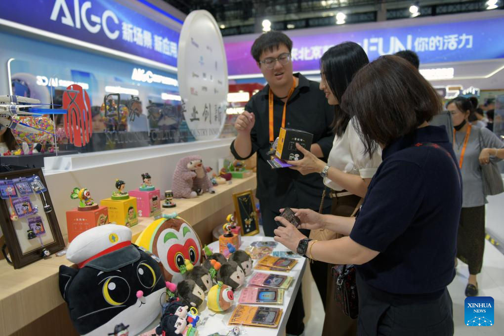 People view cultural and creative products displayed at the 2025 China International Fair for Trade in Services (CIFTIS) in Beijing, capital of China, Sept. 12, 2025. The 2025 CIFTIS is held from Sept. 10 to 14 at the Shougang Park in Beijing. This year's fair features a wide range of cultural and creative products, which are highly popular among visitors. (Xinhua/Zhang Xinjing)