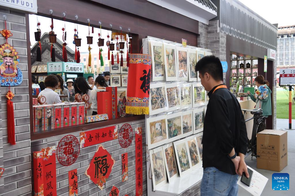 People select cultural and creative products displayed at "Beijing Gift" exhibition area of the 2025 China International Fair for Trade in Services (CIFTIS) in Beijing, capital of China, Sept. 11, 2025. The 2025 CIFTIS is held from Sept. 10 to 14 at the Shougang Park in Beijing. This year's fair features a wide range of cultural and creative products, which are highly popular among visitors. (Xinhua/Liu Lingyi)