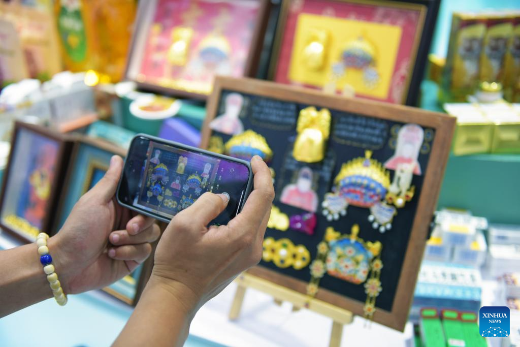 People take pictures of cultural and creative products displayed at the 2025 China International Fair for Trade in Services (CIFTIS) in Beijing, capital of China, Sept. 12, 2025. The 2025 CIFTIS is held from Sept. 10 to 14 at the Shougang Park in Beijing. This year's fair features a wide range of cultural and creative products, which are highly popular among visitors. (Xinhua/Zhang Xinjing)