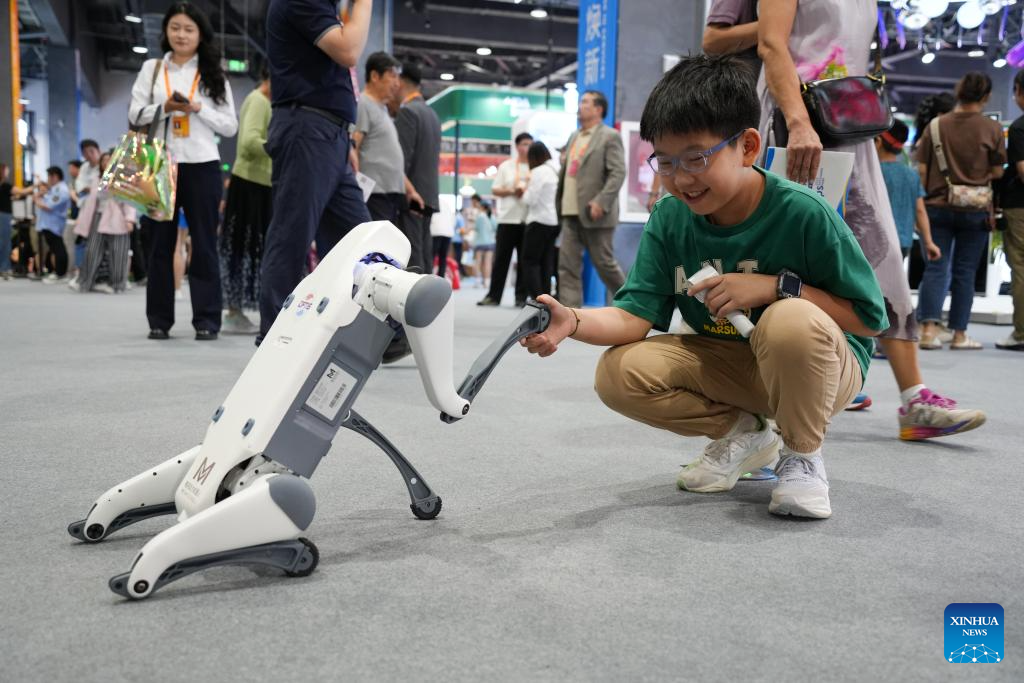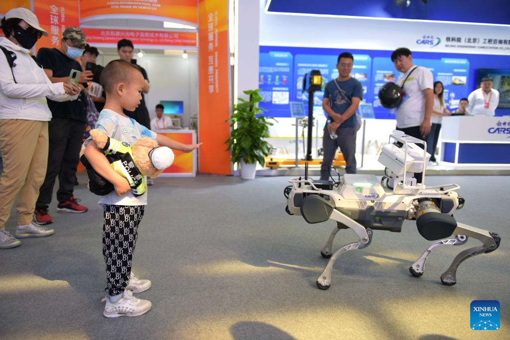 A child interacts with a robot dog at the 2025 China International Fair for Trade in Services (CIFTIS) at Shougang Park in Beijing, capital of China, Sept. 13, 2025. The 2025 CIFTIS opens to the general public from Sept. 13 to 14. Visitors with reservation can access the fair free of charge. (Xinhua/Zhang Xinjing)