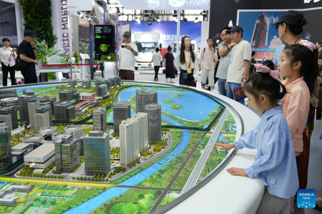 Visitors view a sand table of a car racing track for GT World Challenge during the 2025 China International Fair for Trade in Services (CIFTIS) at Shougang Park in Beijing, capital of China, Sept. 13, 2025. The 2025 CIFTIS opens to the general public from Sept. 13 to 14. Visitors with reservation can access the fair free of charge. (Xinhua/Zhou Tinglu)