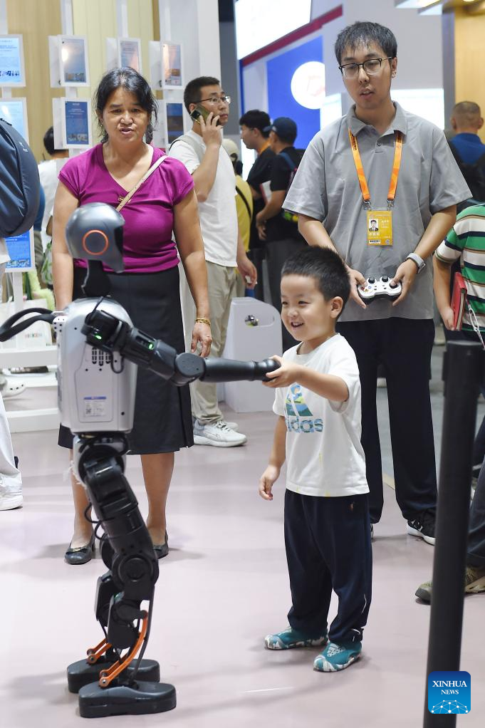 A child interacts with a humanoid robot at the 2025 China International Fair for Trade in Services (CIFTIS) at Shougang Park in Beijing, capital of China, Sept. 13, 2025. The 2025 CIFTIS opens to the general public from Sept. 13 to 14. Visitors with reservation can access the fair free of charge. (Xinhua/Liu Lingyi)