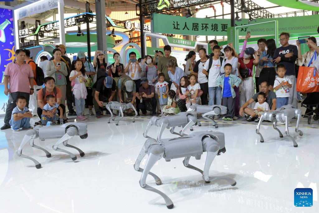 Visitors watch a performance by robot dogs at the 2025 China International Fair for Trade in Services (CIFTIS) at Shougang Park in Beijing, capital of China, Sept. 13, 2025. The 2025 CIFTIS opens to the general public from Sept. 13 to 14. Visitors with reservation can access the fair free of charge. (Xinhua/Zhang Xinjing)