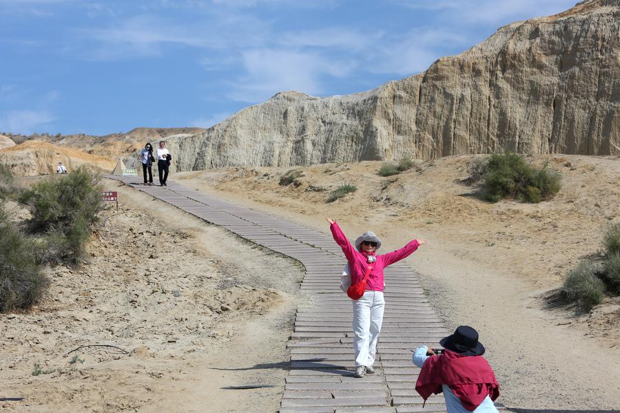 URUMQI, Sept. 13 (Xinhua) -- The Flaming Mountains in northwest China's Xinjiang Uygur Autonomous Region loom heavy in the constant autumn heat, yet, surprisingly, rows of cobalt-blue barrels provide cool temperatures for fish more suited to alpine lakes.