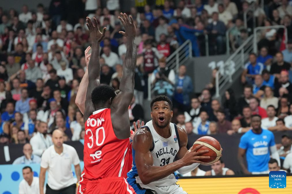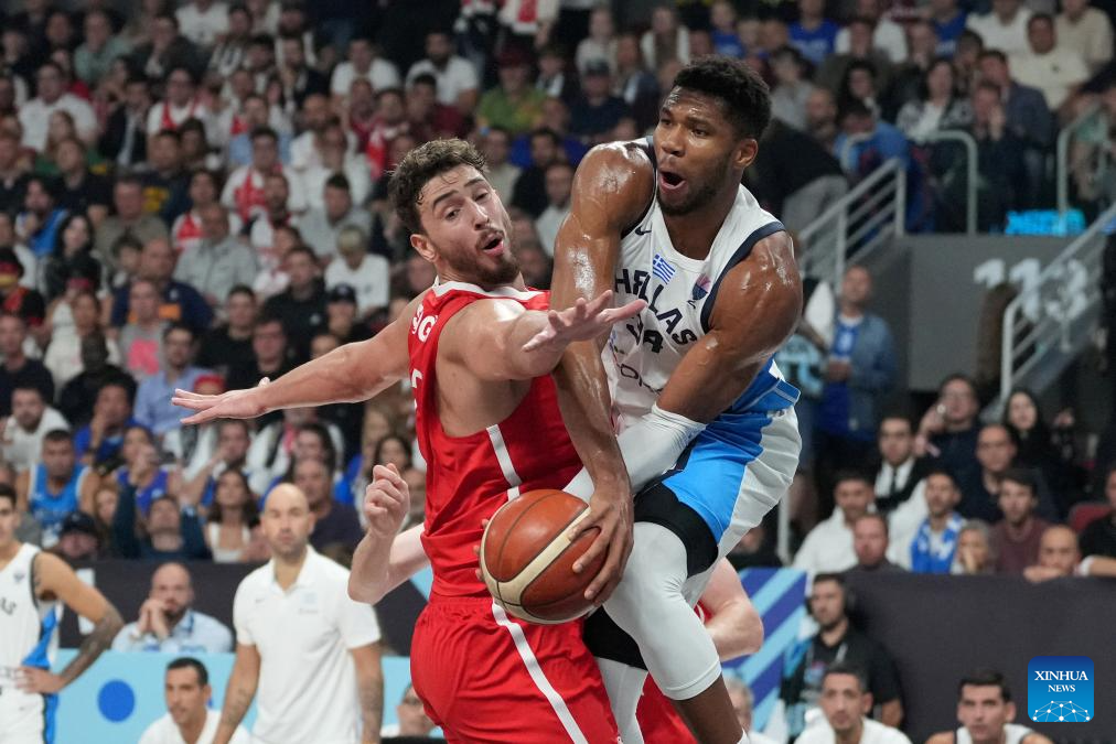 Giannis Antetokounmpo (R) of Greece vies with Adem Bona of Türkiye during the FIBA EuroBasket 2025 semifinal match between Greece and Türkiye in Riga, Latvia, Sept. 12, 2025. (Photo by Edijs Palens/Xinhua)