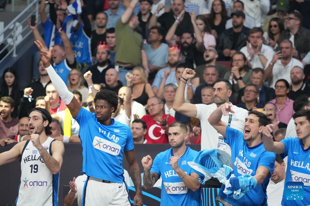 Players of team Greece celebrate during the FIBA EuroBasket 2025 semifinal match between Greece and Türkiye in Riga, Latvia, Sept. 12, 2025. (Photo by Edijs Palens/Xinhua)