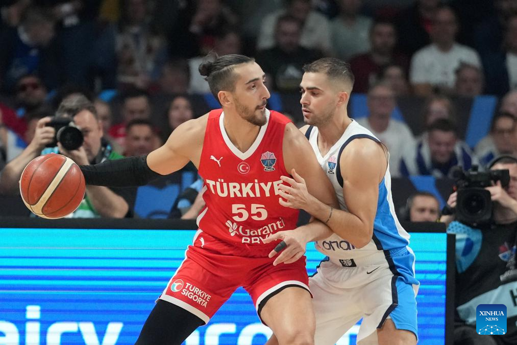Players of team Türkiye celebrate during the FIBA EuroBasket 2025 semifinal match between Greece and Türkiye in Riga, Latvia, Sept. 12, 2025. (Photo by Edijs Palens/Xinhua)