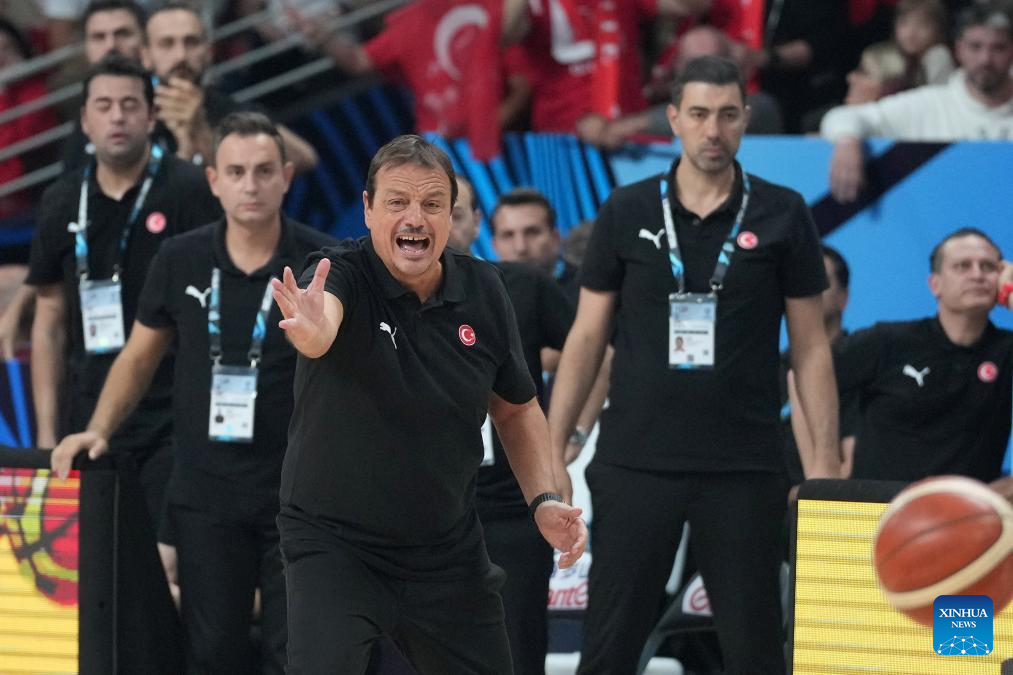 Head coach of Türkiye Ergin Ataman (front) reacts during the FIBA EuroBasket 2025 semifinal match between Greece and Türkiye in Riga, Latvia, Sept. 12, 2025. (Photo by Edijs Palens/Xinhua)