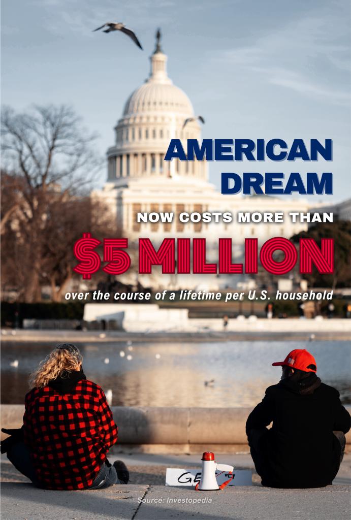 Living the so-called "American Dream" in 2025 now costs over 5 million U.S. dollars. That's the lifetime household price tag for key pillars of classic American middle-class aspiration -- from homeownership, to weddings, kids, and new cars, according to a recent report published by NYC-based financial website Investopedia.