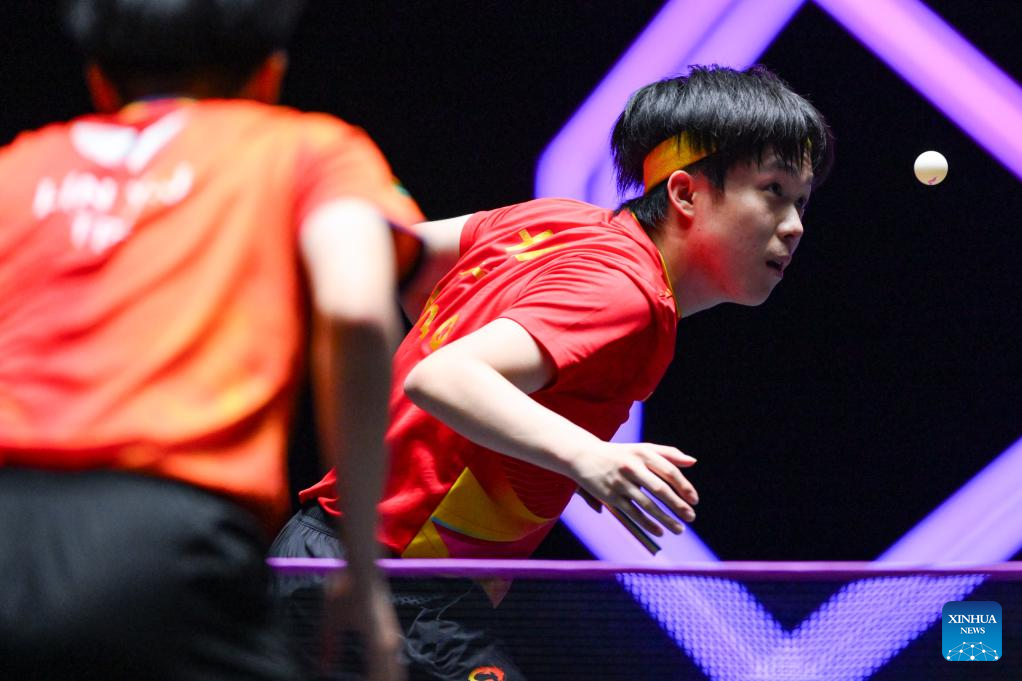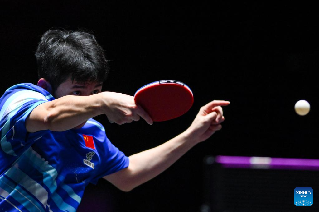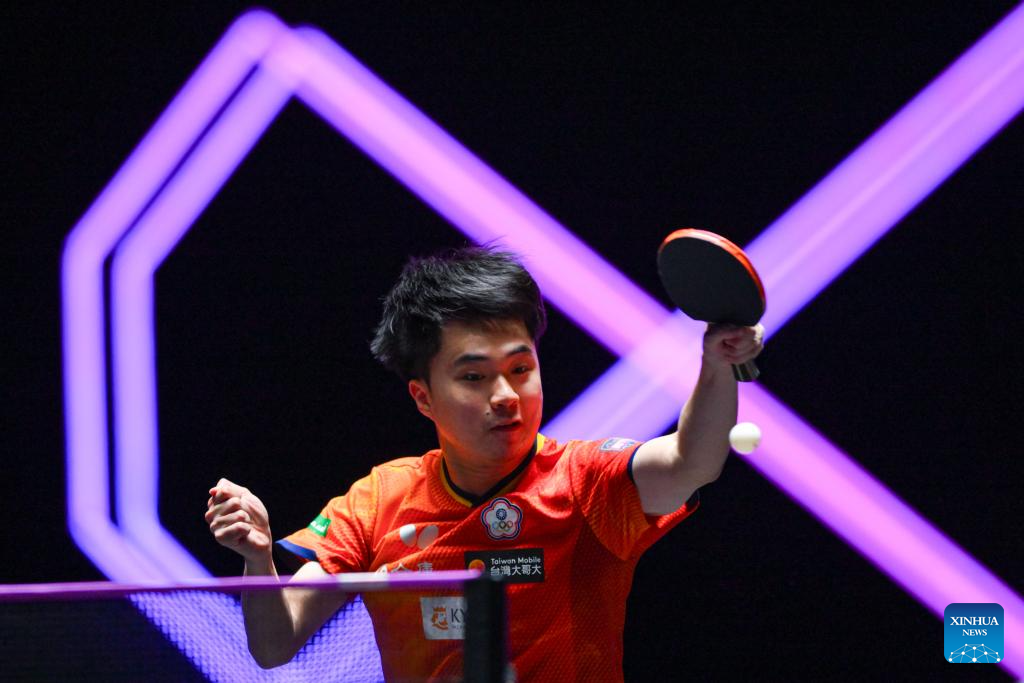 Lin Yun-Ju of Chinese Taipei hits a return during the men's singles quarterfinal match against Wang Chuqin of China at the 2025 World Table Tennis (WTT) Champions Macao in Macao, south China, Sept. 13, 2025. (Xinhua/Cheong Kam Ka)