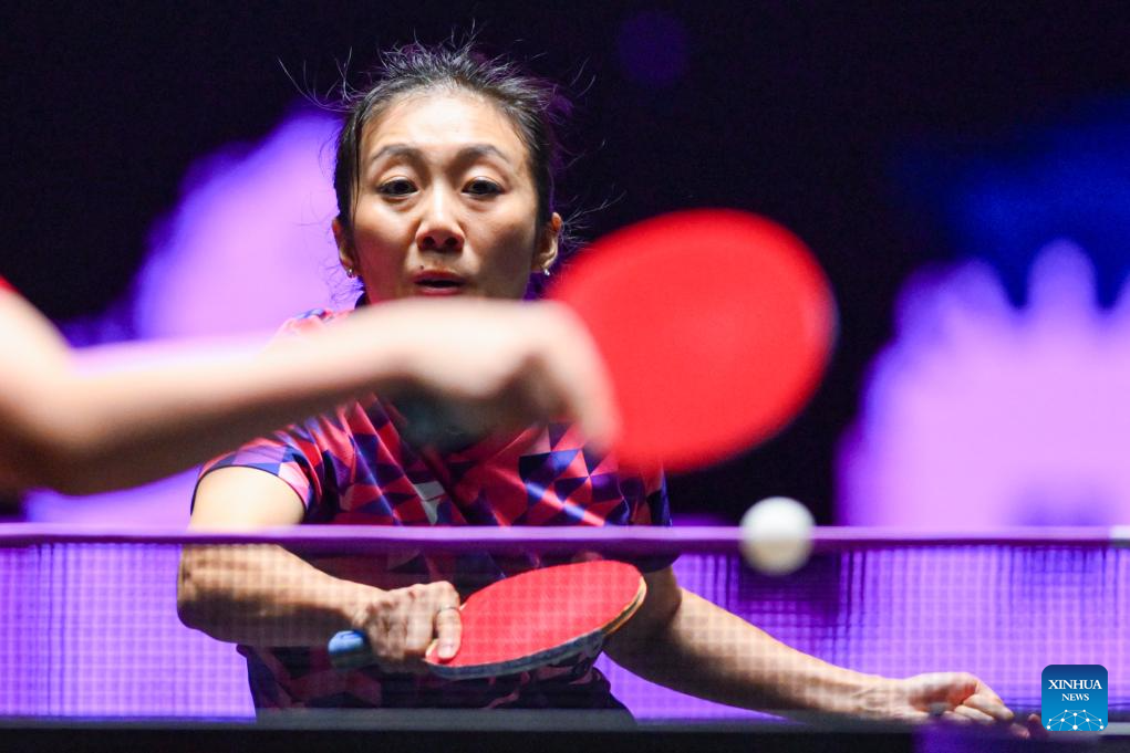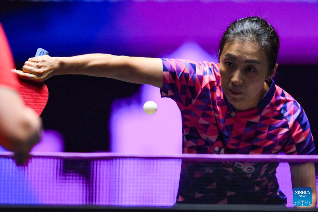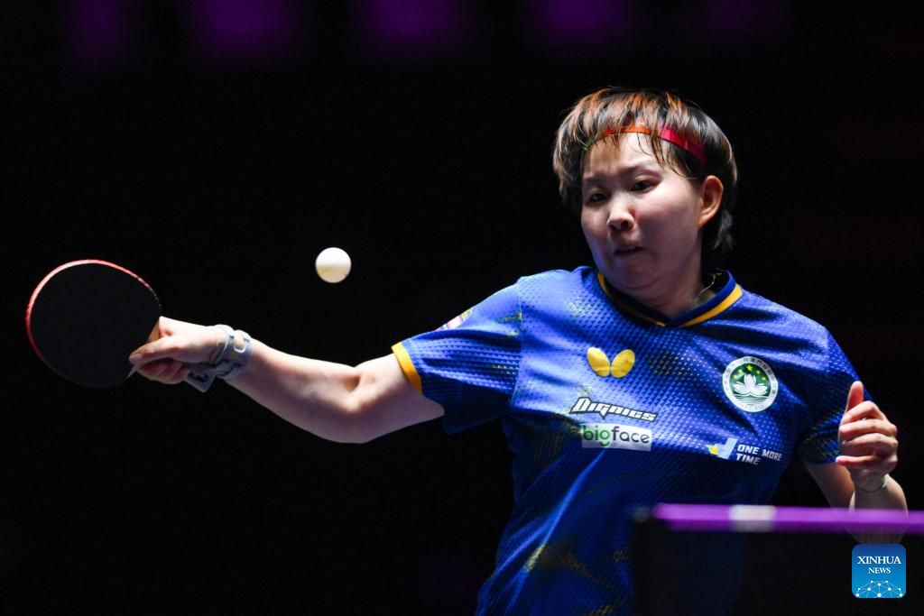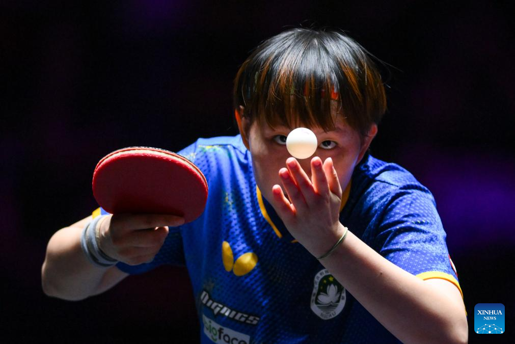 Zhu Yuling of China's Macao hits a return during the women's singles quarterfinal match against Wang Manyu of China at the 2025 World Table Tennis (WTT) Champions Macao in Macao, south China, Sept. 13, 2025. (Xinhua/Cheong Kam Ka)