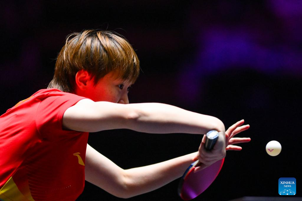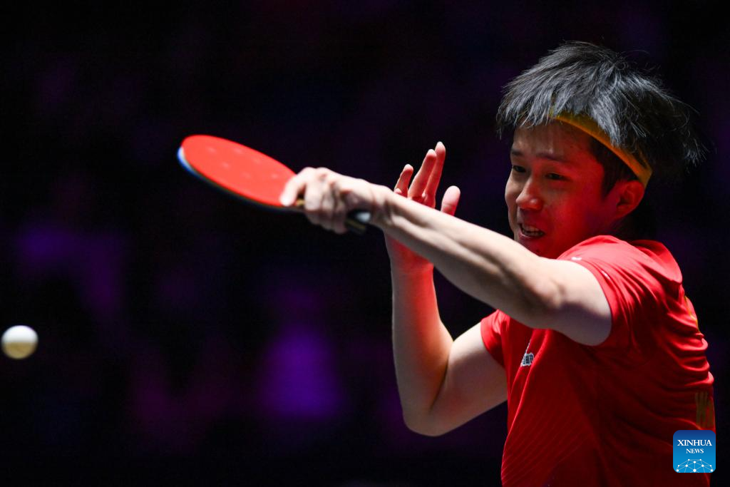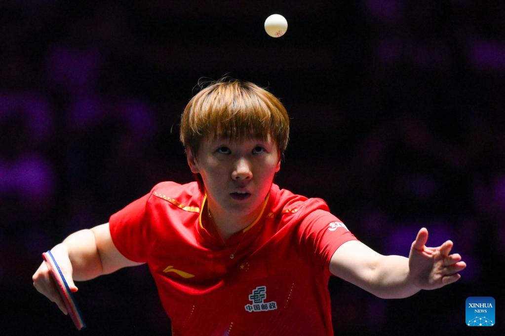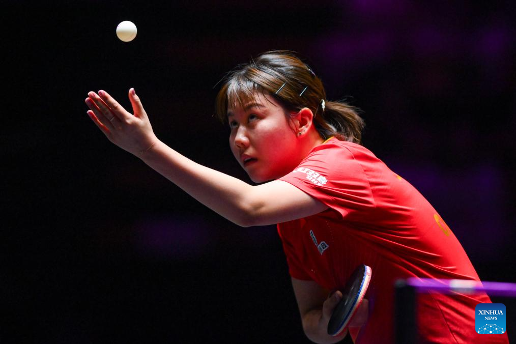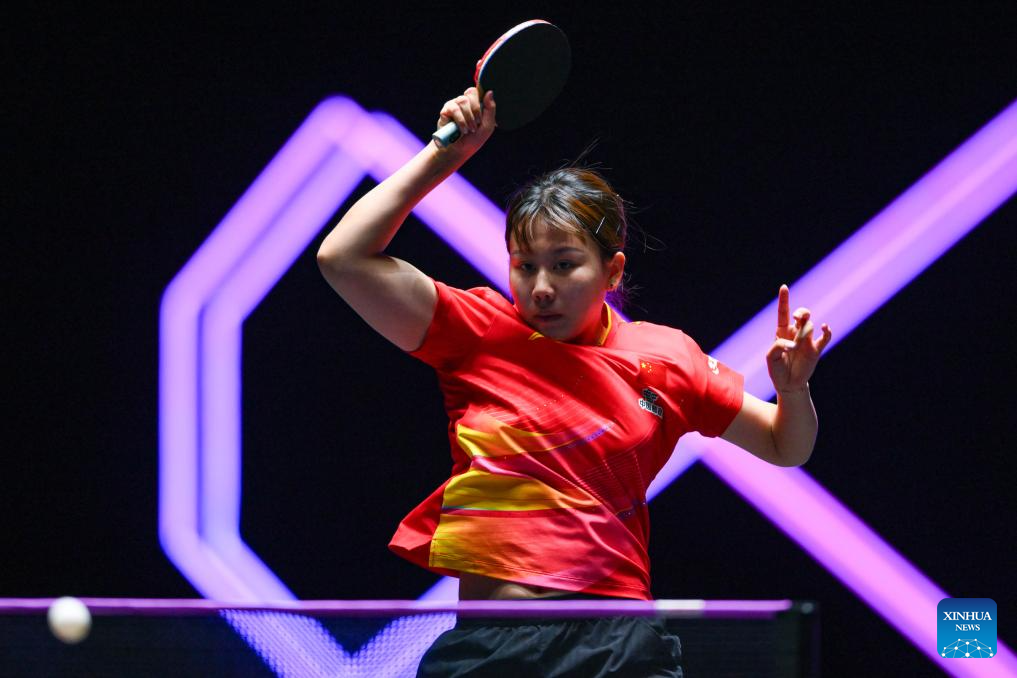 Chen Xingtong of China hits a return during the women's singles quarterfinal match against Ying Han of Germany at the 2025 World Table Tennis (WTT) Champions Macao in Macao, south China, Sept. 13, 2025. (Xinhua/Cheong Kam Ka)