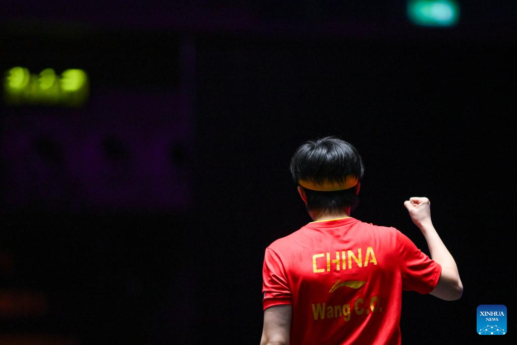 Wang Chuqin of China celebrates scoring during the men's singles quarterfinal match against Lin Yun-Ju of Chinese Taipei at the 2025 World Table Tennis (WTT) Champions Macao in Macao, south China, Sept. 13, 2025. (Xinhua/Cheong Kam Ka)