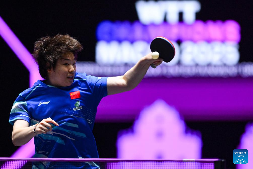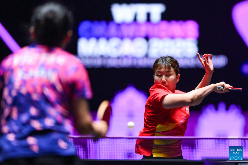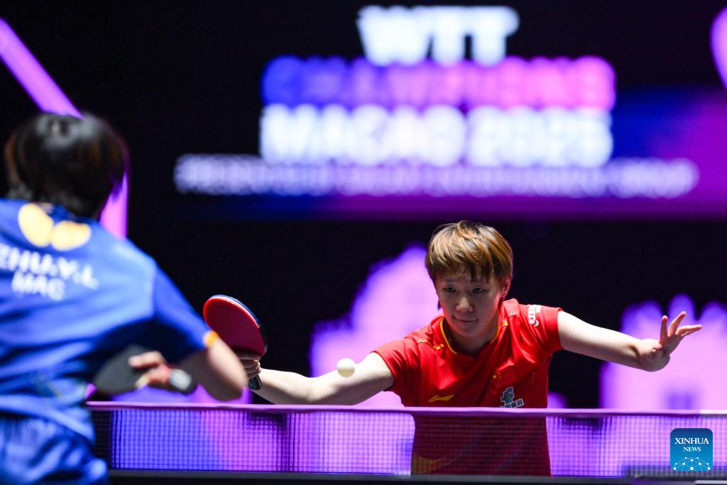 Wang Manyu of China hits a return during the women's singles quarterfinal match against Zhu Yuling of China's Macao at the 2025 World Table Tennis (WTT) Champions Macao in Macao, south China, Sept. 13, 2025. (Xinhua/Cheong Kam Ka)