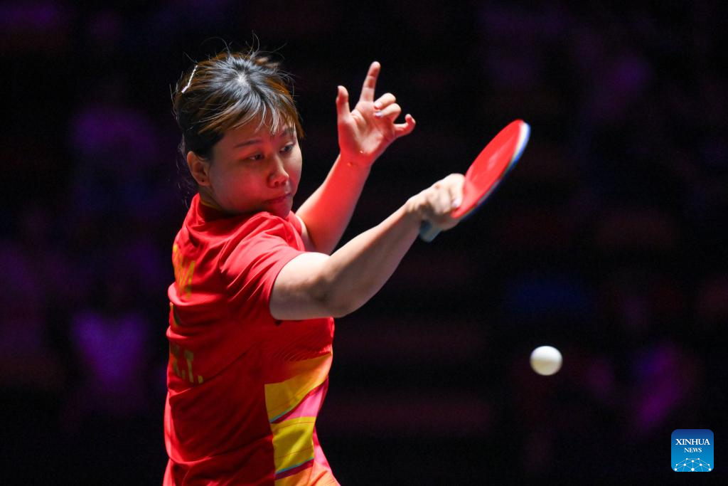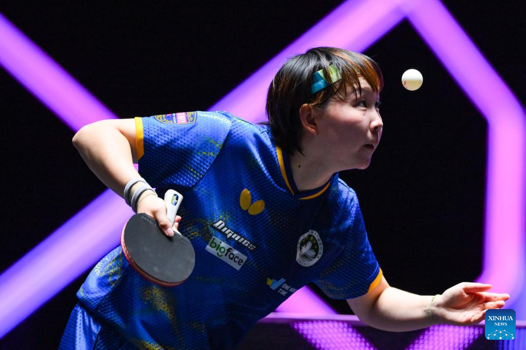 Ying Han of Germany hits a return during the women's singles quarterfinal match against Chen Xingtong of China at the 2025 World Table Tennis (WTT) Champions Macao in Macao, south China, Sept. 13, 2025. (Xinhua/Cheong Kam Ka)