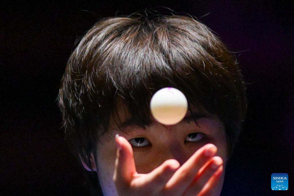 Lin Yun-Ju of Chinese Taipei serves during the men's singles quarterfinal match against Wang Chuqin of China at the 2025 World Table Tennis (WTT) Champions Macao in Macao, south China, Sept. 13, 2025. (Xinhua/Cheong Kam Ka)