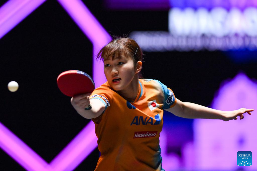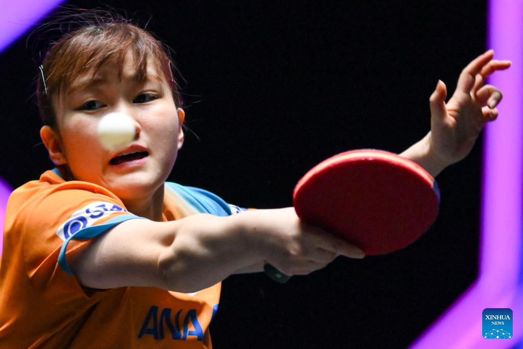 Odo Satsuki of Japan hits a rerturn during the women's singles quarterfinal match against Kuai Man of China at the 2025 World Table Tennis (WTT) Champions Macao in Macao, south China, Sept. 13, 2025. (Xinhua/Cheong Kam Ka)